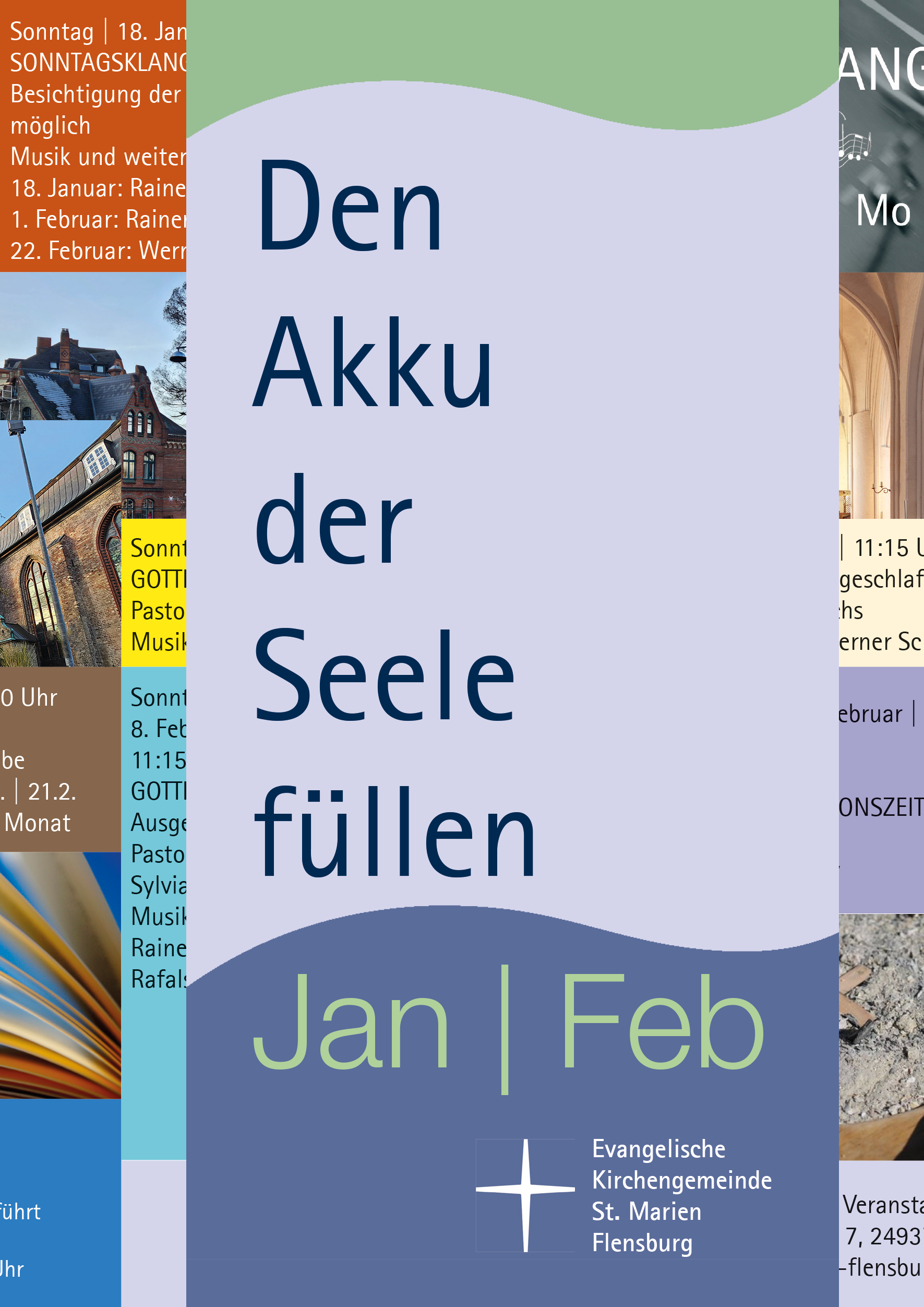 Monatlich erscheint eine Übersicht über die vielfältigen Angebote von und in St. Marien. Der Flyer liegt in der Kirche aus und in zahlreichen Restaurants und Cafés. Auch in Geschäften in der Großen Straße können Sie ihn finden und bei Förde Tourismus.